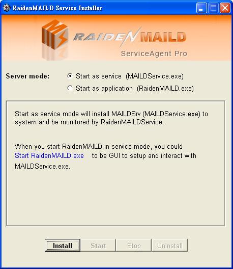 After version 2.1, service installer provides two modes to start RaidenMAILD. One is service mode (NEW mode), another is application mode.