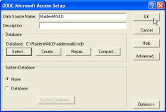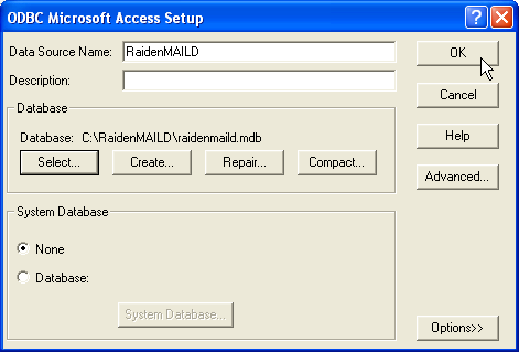 2. Click [System DSN] -> [Add] -> [Microsoft Access Driver (*.mdb)] -> Input a name for this DSN, select the raidenmaild.mdb in raidenmaild directory as your database.
