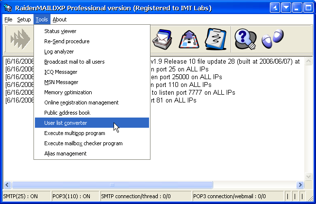 3. In raidenmaild main form. Click [Tools]->[User List Converter]