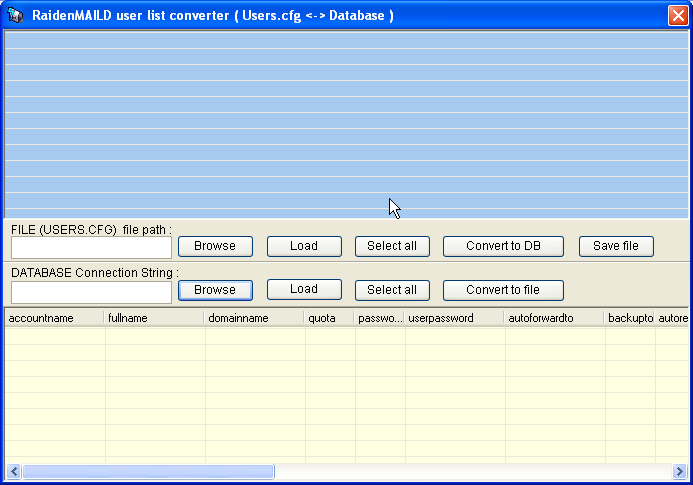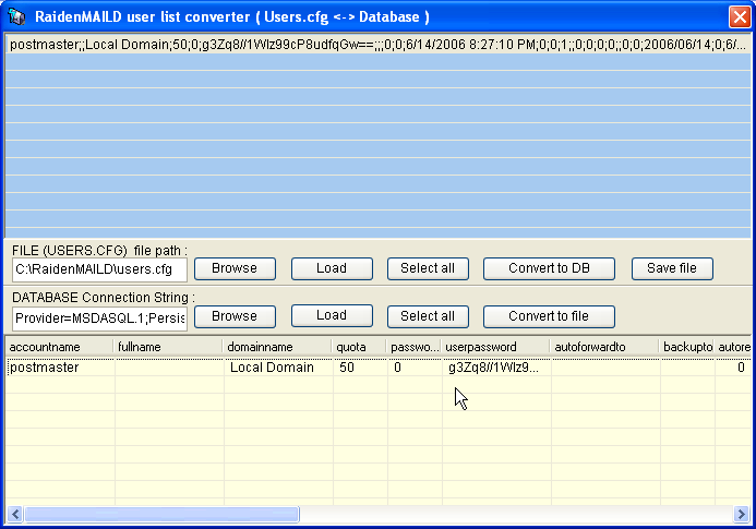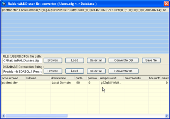 7. Select all data in above list then click [Convert to DB], then you will find the data will be copied to the below list. You can close this tool if the step is done. The raidenmaild.mdb now contains your user list which is copied from users.cfg.