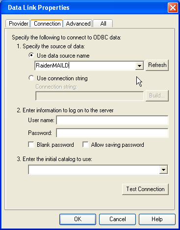 6. Select the DSN name you just inputed in previous step, other fields are not necessary to input data. (If your database is not mdb file, you need to specify your catalog "database name") , then you can test your database connection, if the test is successful, just click [OK] to finish configuration.