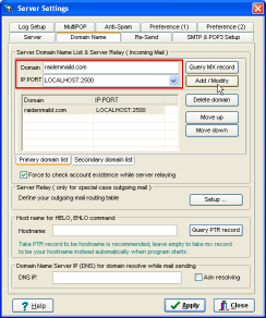 Click [Domain] tab. Add your domain and relay it to LOCALHOST:2500 in the primary domain list ( relay to NAVGW ).