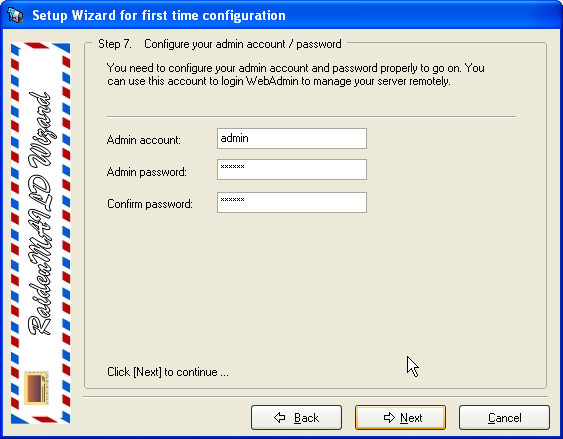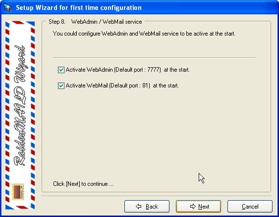 Choose a directory path to install. After installation, a setup wizard will popup to guide you through first time setup. This sample will take raidenmaild.com as sample domain.