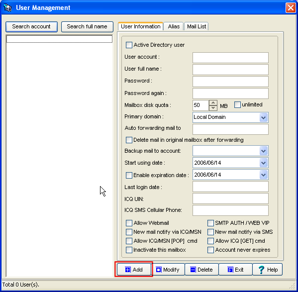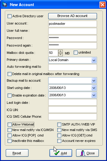 Click [Add] to popup new account form. I suggest you can create postmaster account first to be your system mail address. Then you can create any account you want. From now on, your mail server is ready to work. Congratulations!
